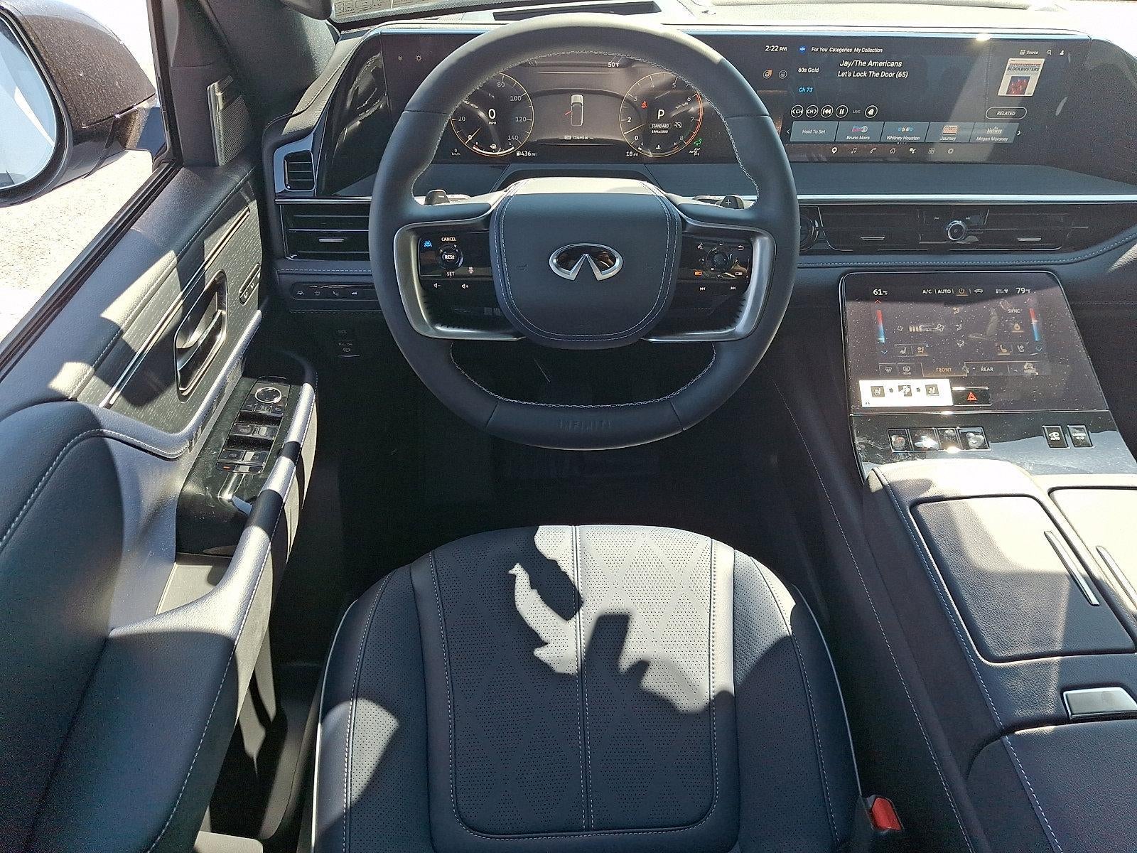 - Radio: Klipsch Reference Premiere Audio System -inc: 24 speakers w/Active Sound Enhancement (ASE), 3D audio, demo mode, individual audio headrest speakers for driver and front passenger, 14.3" infotainment screens w/front control panel, Google built-in w/navigation, Amazon Alexa w/hotword, Bluetooth® hands free phone and audio streaming, wireless Apple CarPlay and Android Auto, hybrid radio, SiriusXM w/360L, INFINITI InTouch services, 5G Wi-Fi hotspot and 2 USB type-C media ports w/iPod interface