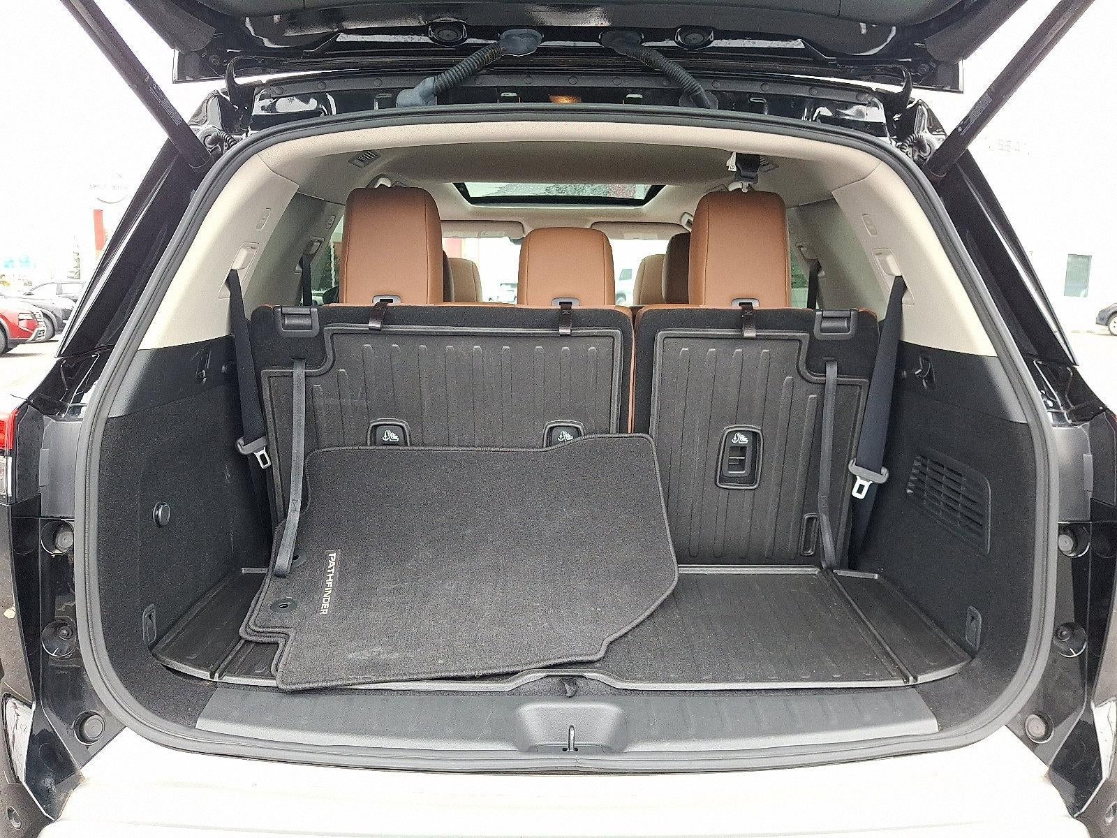 Certified. 2023 Nissan Pathfinder Platinum Super Black *Schedule a test Drive at your home or office*, Nissan Certified Certified, 4WD, 13 Speakers, 2nd-Row Captain Chairs, 2nd-Row Removable Center Console, 3rd row seats: bench, 4-Wheel Disc Brakes, ABS brakes, Air Conditioning, Alloy wheels, AM/FM radio: SiriusXM, Auto High-beam Headlights, Auto tilt-away steering wheel, Auto-dimming Rear-View mirror, Automatic temperature control, Axle Ratio: 4.334, Bodyside moldings, Bose Premium Audio System, Brake assist, Bumpers: body-color, Captain's Chairs Carpeted Floor Mats (Set of 4), Cargo Area Protector, Cargo Net, Cargo Package, Cross Bars, Delay-off headlights, Driver door bin, Driver vanity mirror, Dual front impact airbags, Dual front side impact airbags, Electronic Stability Control, Emergency communication system: NissanConnect Services, Exterior Parking Camera Rear, First Aid Kit, Four wheel independent suspension, Front anti-roll bar, Front Bucket Seats, Front Center Armrest, Front dual zone A/C, Front reading lights, Fully automatic headlights, Garage door transmitter: HomeLink, Heads-Up Display, Heated & Cooled Front Bucket Seats, Heated door mirrors, Heated front seats, Heated rear seats, Heated steering wheel, Illuminated entry, Illuminated Kick Plate, Knee airbag, Leather steering wheel, LED Fog Lamps, Lighting Package (N93), Low tire pressure warning, Memory seat, Navigation system: NissanConnect Navigation, Nissan USB Charging Cable Set, NissanConnect w/Navigation & Services, Occupant sensing airbag, Outside temperature display, Overhead airbag, Overhead console, Panic alarm, Passenger door bin, Passenger vanity mirror, Platinum Captain Chairs Package, Power door mirrors, Power driver seat, Power Liftgate, Power moonroof, Power passenger seat, Power steering, Power windows, Radio data system, Radio: AM/FM Audio System, Rain sensing wipers, Rear air conditioning, Rear anti-roll bar, Rear reading lights, Rear seat center armrest, Rear side impact airbag, Rear window defroster, Rear window wiper, Reclining 3rd row seat, Remote keyless entry, Running Boards, Security system, Semi-Aniline Leather Seating Surfaces, Speed control, Speed-sensing steering, Speed-Sensitive Wipers, Split folding rear seat, Spoiler, Steering wheel memory, Steering wheel mounted audio controls, Tachometer, Telescoping steering wheel, Tilt steering wheel, Traction control, Trip computer, Turn signal indicator mirrors, Variably intermittent wipers, Ventilated front seats, Welcome Lighting, Wheels: 20" Machined Alloy w/Dark Met Gray Finish, 4WD.