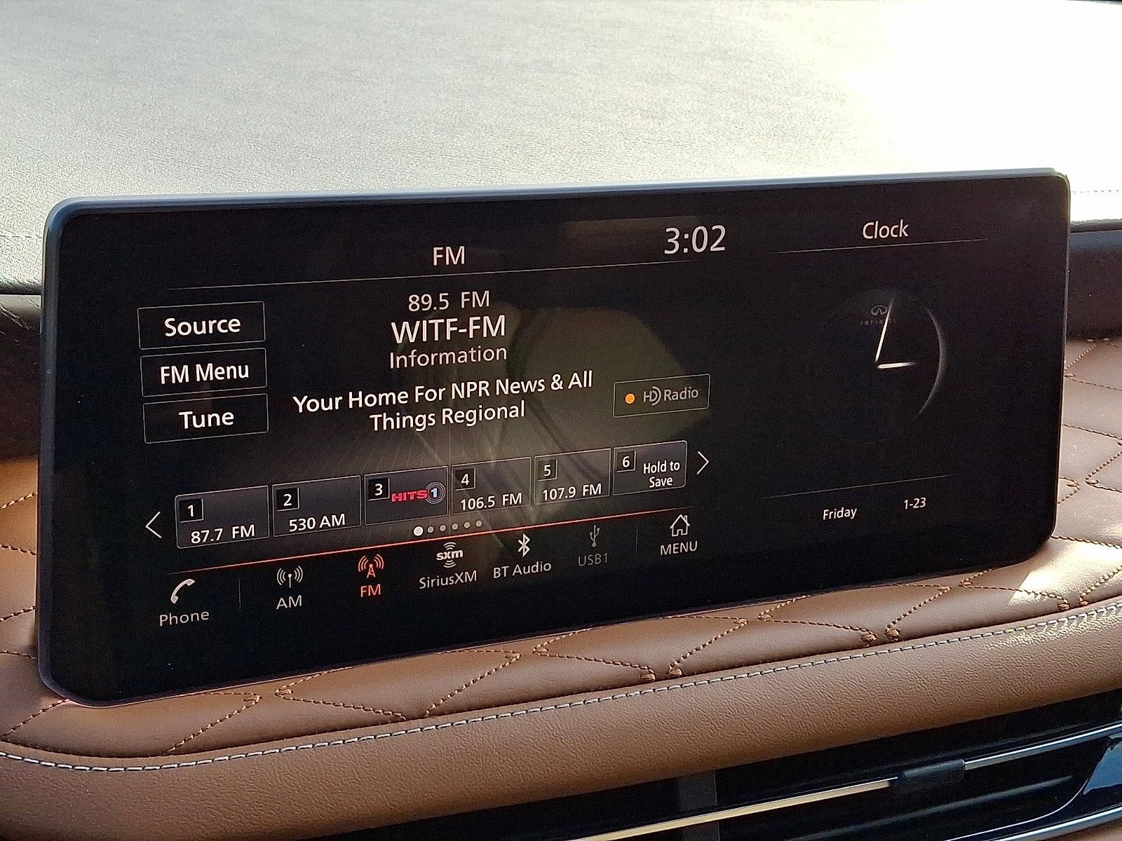 - Radio: Bose Performance Series -inc: 17 speakers, INFINITI InTouch 12.3" interactive display w/navigation (includes mapcare and premium traffic), INFINITI InTouch w/wireless Apple CarPlay integration and Android Auto (includes Bluetooth®), HD Radio technology, SiriusXM radio, WiFi hotspot, INFINITI voice recognition w/Siri Eyes Free/Google Assistant, INFINITI InTouch services, Active Noise Cancellation (ANC), Bluetooth® hands-free phone/voice control switches, data capable type-A and type C USB connection ports and steering wheel audio controls